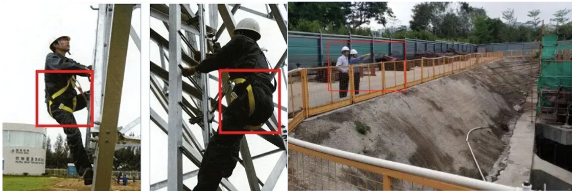 安全繩/安全帶識(shí)別:通過(guò)目標(biāo)檢測(cè)獲取工作人員的位置信息,裁剪出人體圖像區(qū)域,再通過(guò)人體表面關(guān)鍵特征目標(biāo)檢測(cè)(肩部、腰部錨安全繩/安全帶)判斷安全繩系掛狀態(tài),識(shí)別是否為“未系掛”違規(guī)行為。臨邊洞口防護(hù)識(shí)別:通過(guò)目標(biāo)識(shí)別獲取工地現(xiàn)場(chǎng)地面上的洞口區(qū)域,裁剪出洞口及周邊區(qū)域,通過(guò)識(shí)別判斷洞口附近是否存在防護(hù)欄桿,再采用U-Net++分割模型分割得到洞口與防護(hù)蓋板的面積,計(jì)算出洞口防護(hù)覆蓋率。
