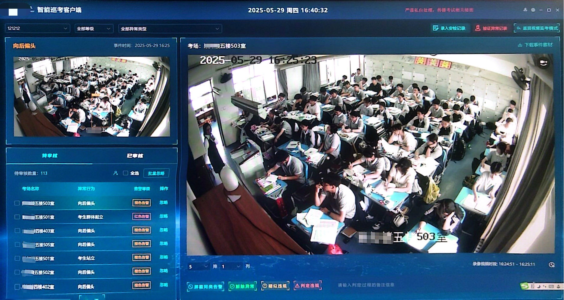 系統(tǒng)的核心突破在于顛覆傳統(tǒng)“事后追溯”機制,開創(chuàng)“實時發(fā)現(xiàn)-現(xiàn)場處置”的新模式。通過AI算法對考場視頻的毫秒級解析,系統(tǒng)可精準(zhǔn)識別考生頻繁轉(zhuǎn)頭、傳遞物品等30類異常行為,并在0.5秒內(nèi)自動框選目標(biāo)、標(biāo)注行為類型并推送預(yù)警。經(jīng)初審與復(fù)審兩級人工確認(rèn)后,監(jiān)考人員可立即干預(yù),極大提升作弊行為震懾力,有效解決人工監(jiān)考強度大、時效低、追溯難等痛點。此外,系統(tǒng)具備智能回溯功能,支持考點與上級部門通過關(guān)鍵畫面截圖、異常錄像等數(shù)據(jù)對考試全程進(jìn)行追溯審查,確保違規(guī)行為無處遁形。